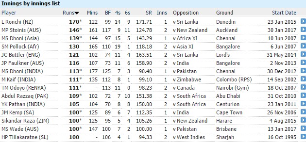 Marcus Stoinis scored 146 runs of 117 balls, and almost pulled off an astonishing win against New Zealand at Eden Park, Auckland on January 30, 2017. In the process, Stoinis became the second highest scorer in an ODI innings batting at No.7, narrowly missing out on record holder Luke Ronchi’s 170 v Sri Lanka.